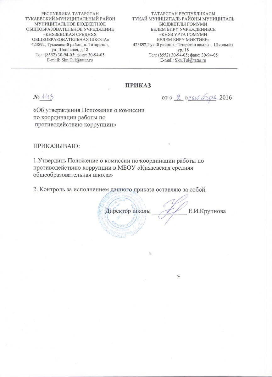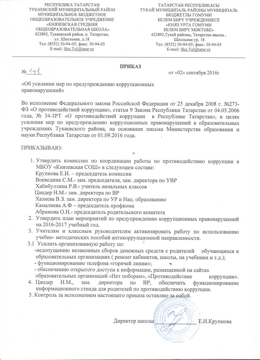 План работы МБОУ «Князевская СОШ» по координации работы по противодействию коррупции на 2016-2017г.