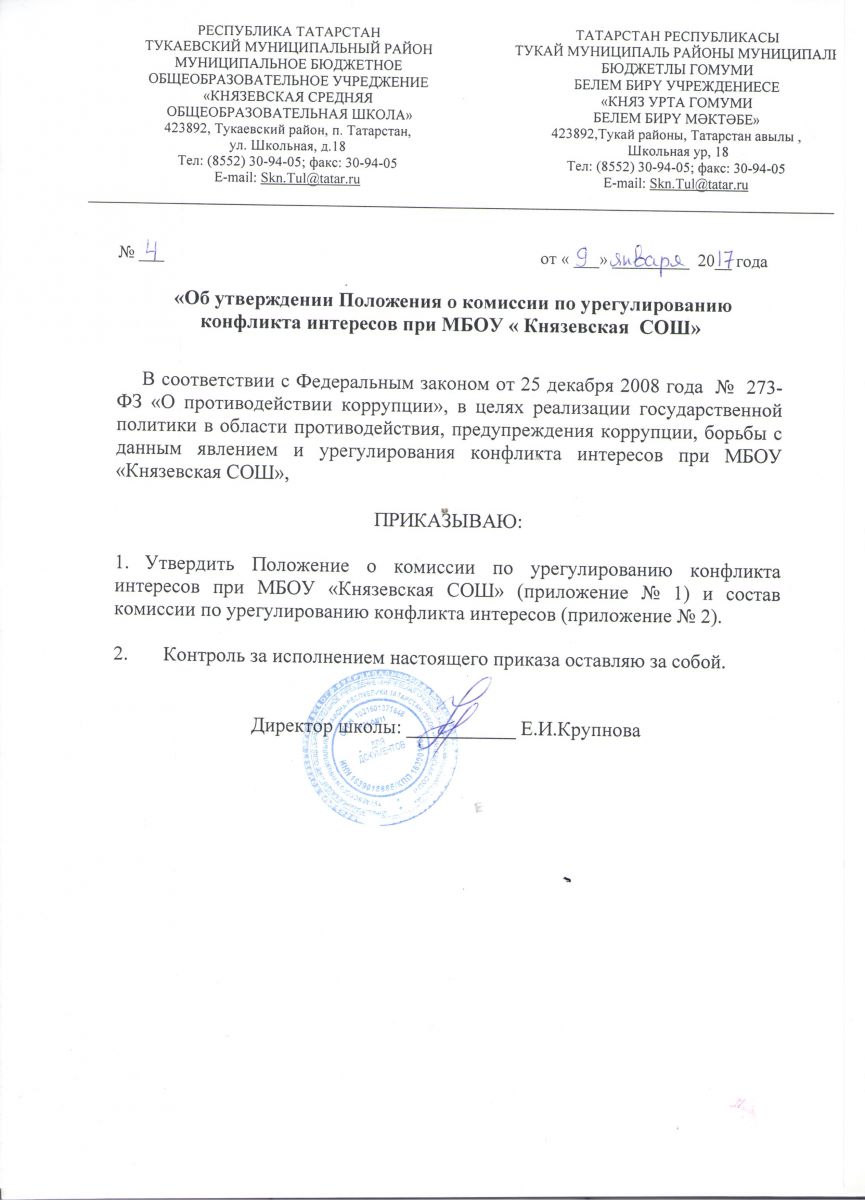 Положения о комиссии по урегулированию конфликта интересов при МБОУ "Князевская СОШ"