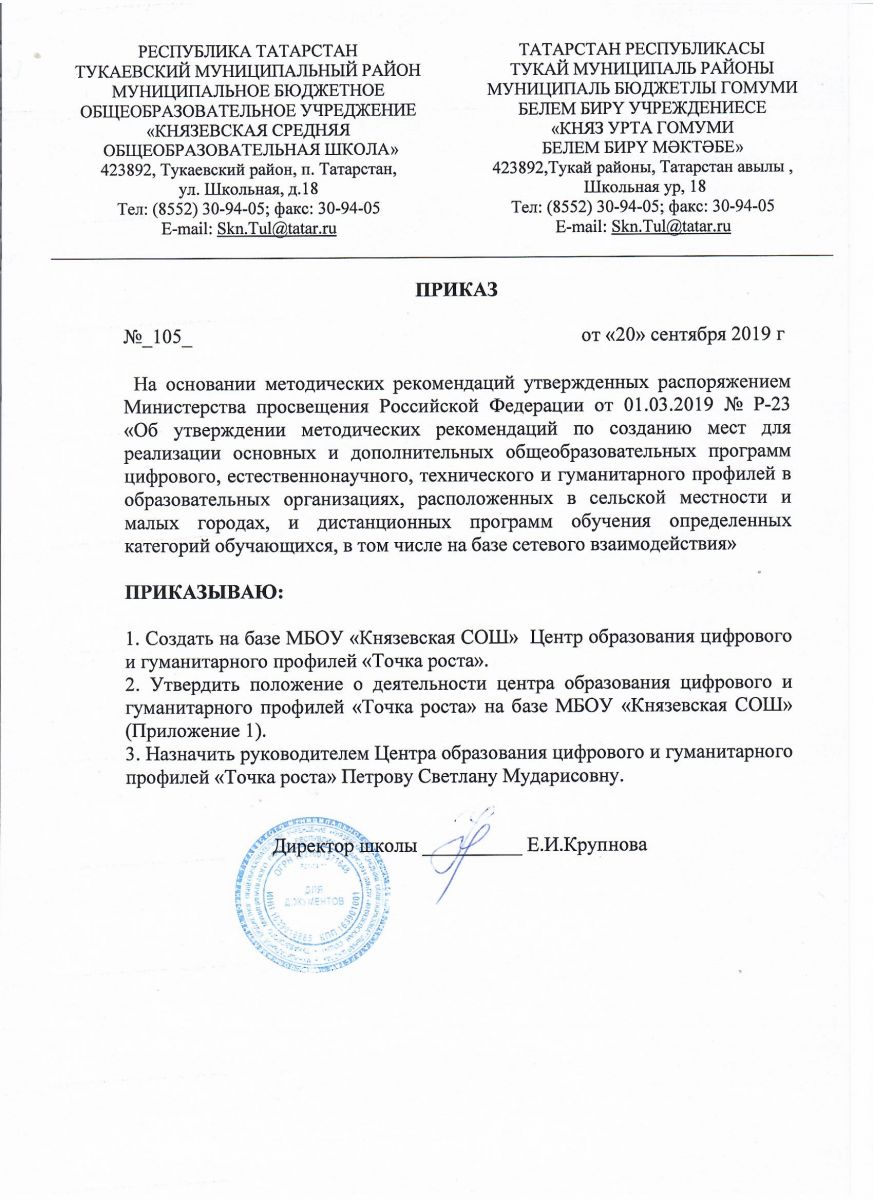 - Положение о деятельности центра образования цифрового и гуманитарного профилей «Точка роста» на базе муниципального бюджетного общеобразовательного учреждения «Князевская средняя общеобразовательная школа» Тукаевского района