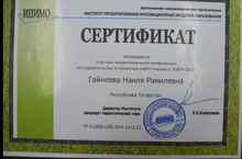 vv Сертификатом участника международной конференции исследовательских и проектных работ (КИПР-2013) награждена ученица 11 класса Гайнеева Наиля (учитель Гайнеева Д.Ф.)