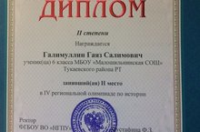 Дипломом II степени награждается Галимуллин Гаяз ученик 6 класс в IV региональной олимпиаде по истории, который прошел в НГПУ.