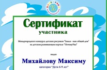 Учащиеся нашей школы Сальникова Карина и Михайлов Максим приняли участие в международном конкурсе детских рисунков "Земля - наш общий дом" на детском развивающем портале "ПочемуЧка".