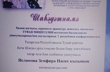 Учитель татарского языка и литературы Исламова З.Н. активно участвовала в 1 республиканской конференции учеников и учителей, посвещенной памяти народного писателя , видного драматурга, общественного деятеля Туфана Миннуллина со статьей "Хэзэрге заман шартларында кызларга милли тэрбия биру".