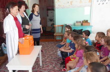 Бакча балалары Мусабай-Завод авылы медпункты хезмәткәрләре белән Санитар сумкасы тутырырга өйрәнәләр.