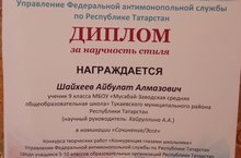 Ученик 9 класса Шайхеев Айбулат награжден Дипломом по РТ за научность стиля в номинации "Сочинение/Эссе" конкурса творческих работ "Конкуренция глазами школьника". Руководитель Хайруллина А.А.