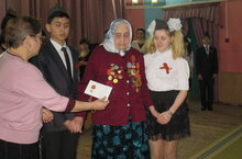 Сугыш ветераннарына һәм тыл хезмәтчәннәренә медаль тапшыру тантанасында мәктәп укучылары да катнашты. Алар ветераннарын каршы алып һәм озатып тордылар.