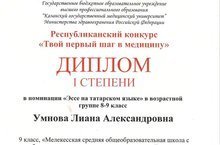 19 апреля 2015 года в Казанском медицинском университете (КГМУ) прошел день открытых дверей. Здесь наградили особо отличившихся в конкурсах «Твой первый шаг в медицину» и «Будущее медицины» . По итогам этих конкурсов ученица 9 класса Умнова Л.А. стала победителем конкурса эссе и абсолютным победителем финального тура.