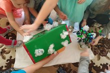 На сегодняшнем занятии по развитию речи воспитанники средней группы помогали Деду Морозу. Они покрывали снегом крышу дома и дерево.
