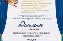 Театральный коллектив "Әллүки" (рук. Хайрутдинова Г.Н. и Шайхетдинова Л.К.) участвовал в IV Республиканском конкурсе Сценического искусства "Театр как театр" и стал обладателем Диплома II степени в номинации "Драматический театр". Поздравляем ребят и их руководителей! Желаем дальнейших творческих успехов и ждем новых интересных постановок!