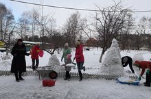 На террирории детского сада под чутким руководством воспитателей совместно с родителями начали строительство снежного городка.