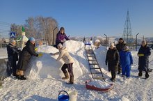 Работники детского сада совместно с родителями воспитанников приступили к лепке снежного городка.