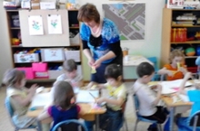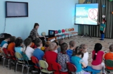 На снимке представлен один из видов образовательной деятельности, осуществляемый в ходе режимных моментов - совместный просмотр слайд-шоу на тему "Правила дорожного движения" ( Образовательная область - "Безопасность", подготовительная группа).