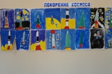 В средней и подготовительной группах организована выставка детских рисунков на тему "Покорение космоса!"