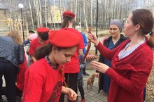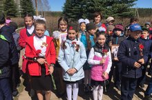 В парке пос.Новый отряд ЮНАРМЕЙЦЕВ раздавали жителям георгиевские ленточки - символ праздника Дня Победы. -