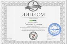 Ученицу 11 класса, Салахову Ильвину Маратовну - победителя во Всероссийской дистанционной олимпиаде по информатике проекта "Инфоурок" (2 место)