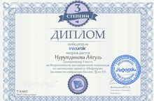 Ученицу 7 класса, Нурутдинову Айгуль Айратовну - победителя во Всероссийской дистанционной олимпиаде по математике проекта "Инфоурок" (3 место).