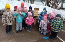 На прогулке они насыпали в кормушки зернышки. Так же мы снетерпением ждем наших перелётных друзей - Скворцов. Месте мы почистили скворечники и совместно с родителями подготовили новые.