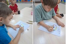 В старшей группе "Звездочки" воспитатель Ахаева О.Ю. весело и с применением необычных техник проводит ежедневные занятия. Вот и для закрепления счёта Ольга Юрьевна выбрала дидактическую настольную игру "Пингвин играет с кубиками". Через такие игры дети весело закрепляют пройденный материал.