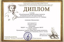 Наша воспитанница подготовительной группы "Жемчужинки" Андреева Есения в начале этого года участвовала в I Республиканском открытом конкурсе творчества "Я памятник воздвиг себе нерукотворный...", посвященный великому русскому поэту Александру Сергеевичу Пушкину, в номинации "Видеоролик", и удостоилась Дипломом I степени. Руководители: Садикова З.Н., Иванова Р.Г. Поздравляем и желаем дальнейших успехов и побед!