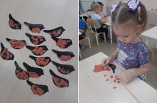 Во второй младшей группе «Капельки» педагог Ахаева О.Ю. провела занятие по художественно-эстетическому развитию – разрывная аппликация «Снегири». Перед выполнением работы Ольга рьевна провела беседу по ознакомлению детей с зимующими птицами нашего региона России.