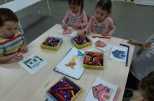 Сегодня в старше группе «Малыши» воспитатель Чернова В.Е. познакомили детей с учебно-игровым пособием «Логические блоки Дьенеша». Воспитатель рассказала детям, что же представляют собой эти материалы. Ребята складывали из блоков различные картины на шаблонах.