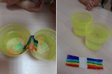 Воспитанники второй младшей группы «Капельки» совместнос с педагогом Ахаевой О.Ю. провели очень легкий, быстрый и очень интересный опыт с использованием фломастеров, салфеток и простой воды. Результат: вода по салфетке быстро поднялась вверх, закрашивая кусок салфетки цветными полосками. Получилась радуга! Дети в восторге!