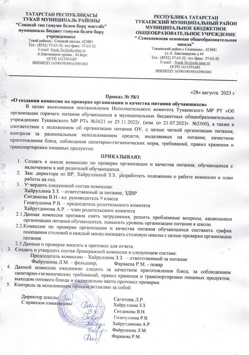 Приказ школы о создании комиссии по проверке организации и качества питания обучающихся