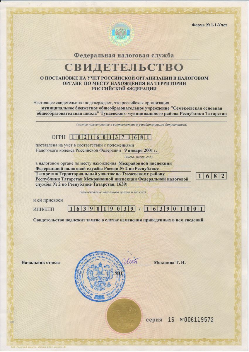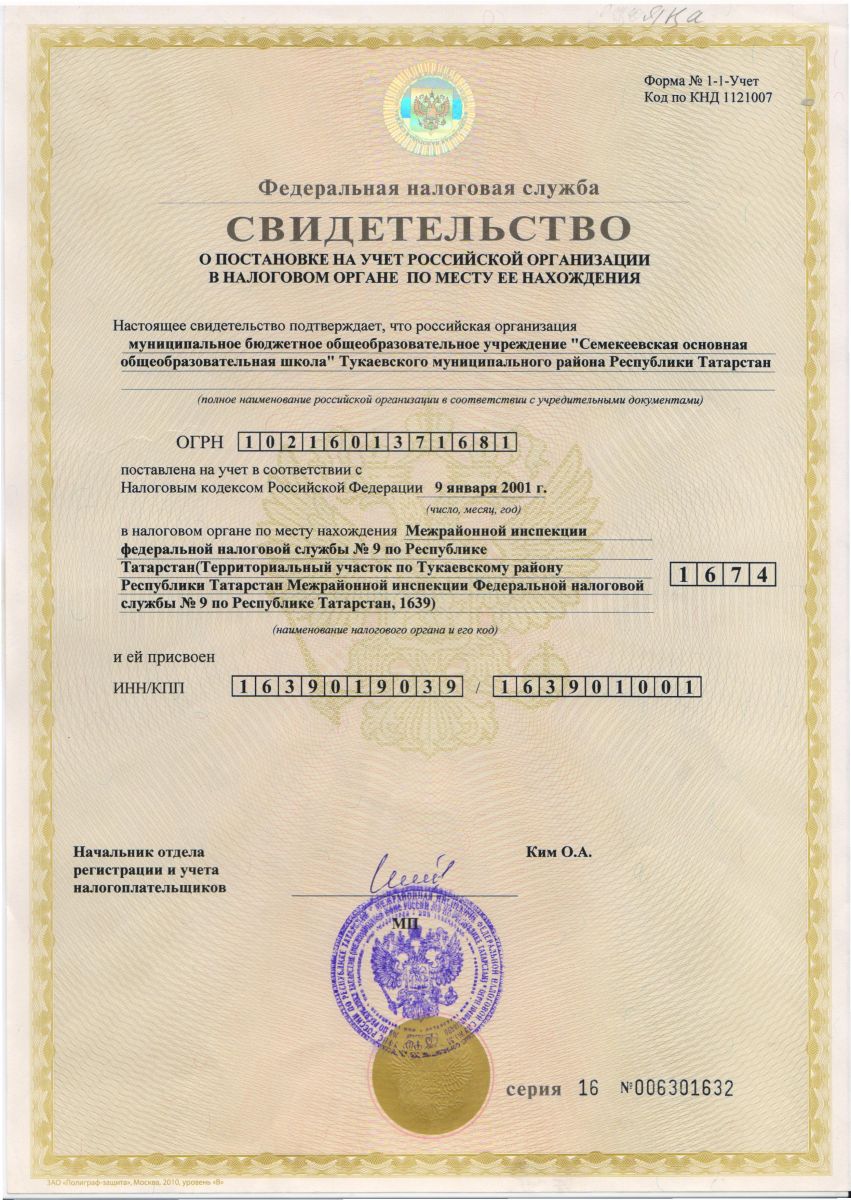 Свидетельство о постановке на учет российской организации в налоговом органе по месту ее регистрации