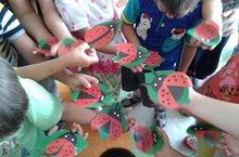 В день именинника к ребятам приходила в гости Поздравлялка и прилетал Карлсон. Дети пели дружно каравай друг для друга, участвовали в конкурсах, танцевали под веселые песни и конечно же, в завершении праздника получили сладкие подарки от Поздравлялки.