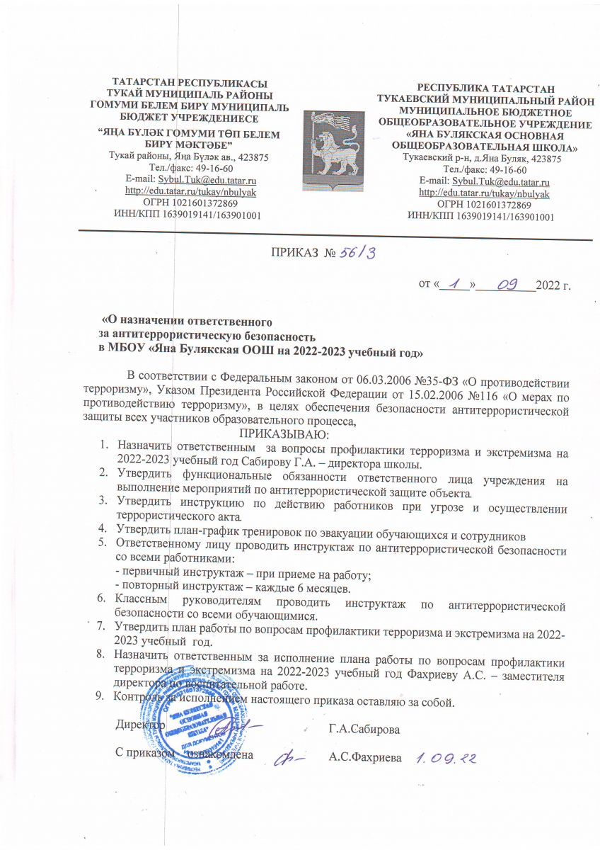 Приказ о назначении ответственного за антитеррористическую безопасность на 2022-2023 учебный год