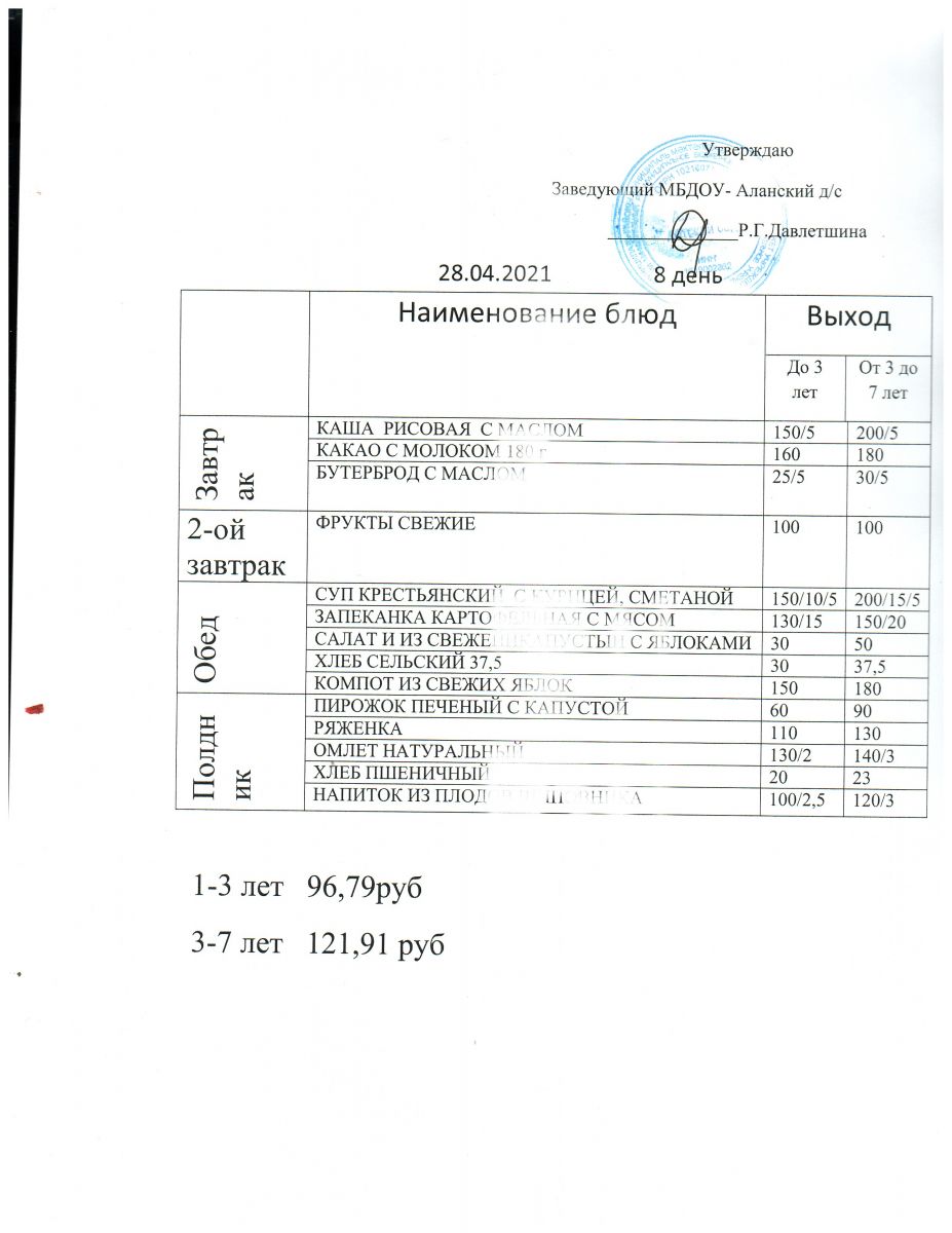 Однодневное меню на 28.04.2021 год