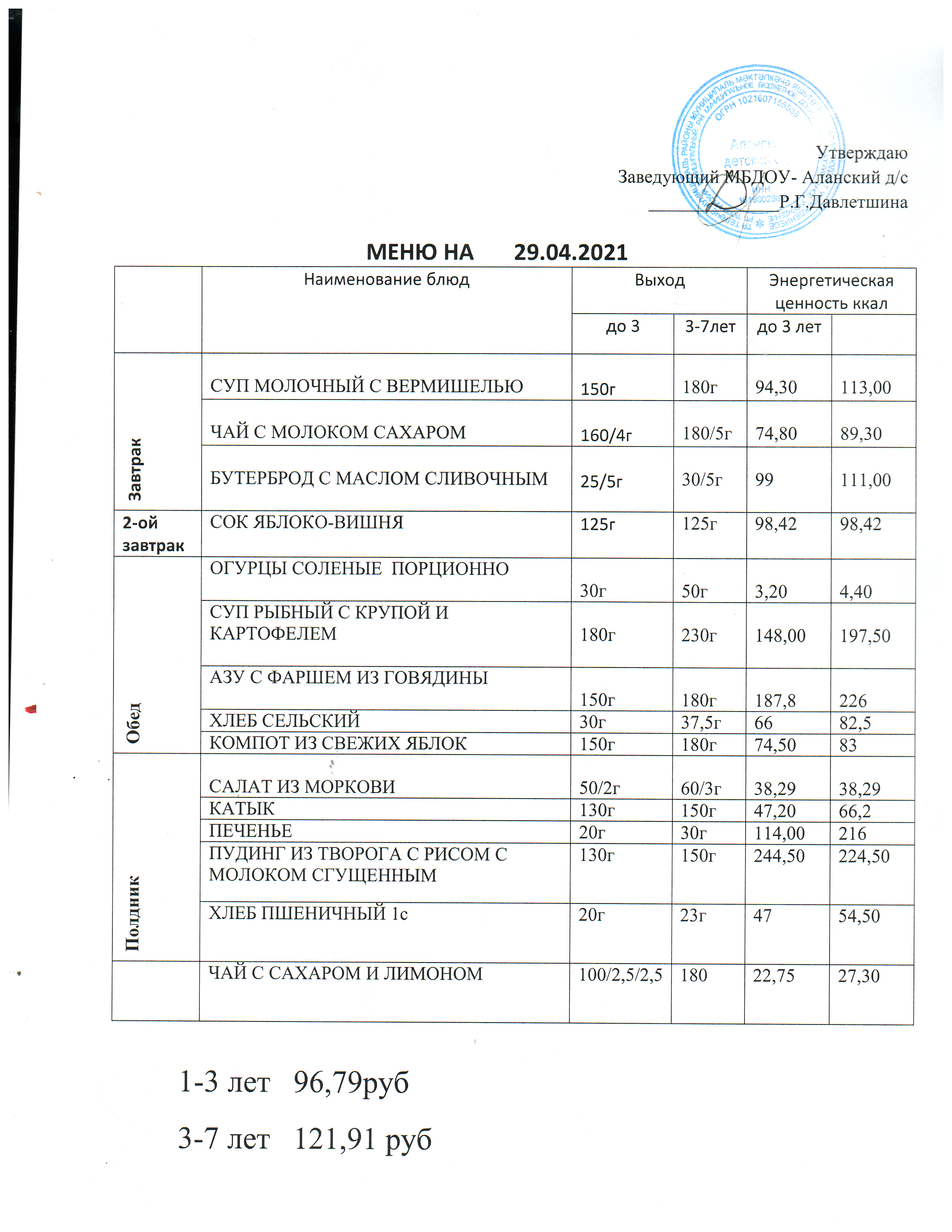 Однодневное меню на 29.04.2021 год