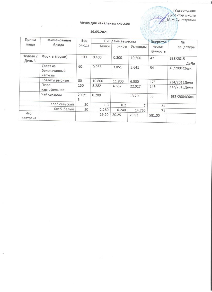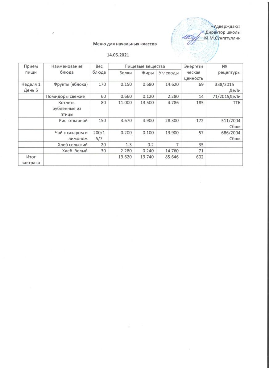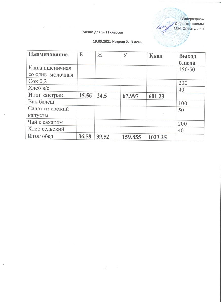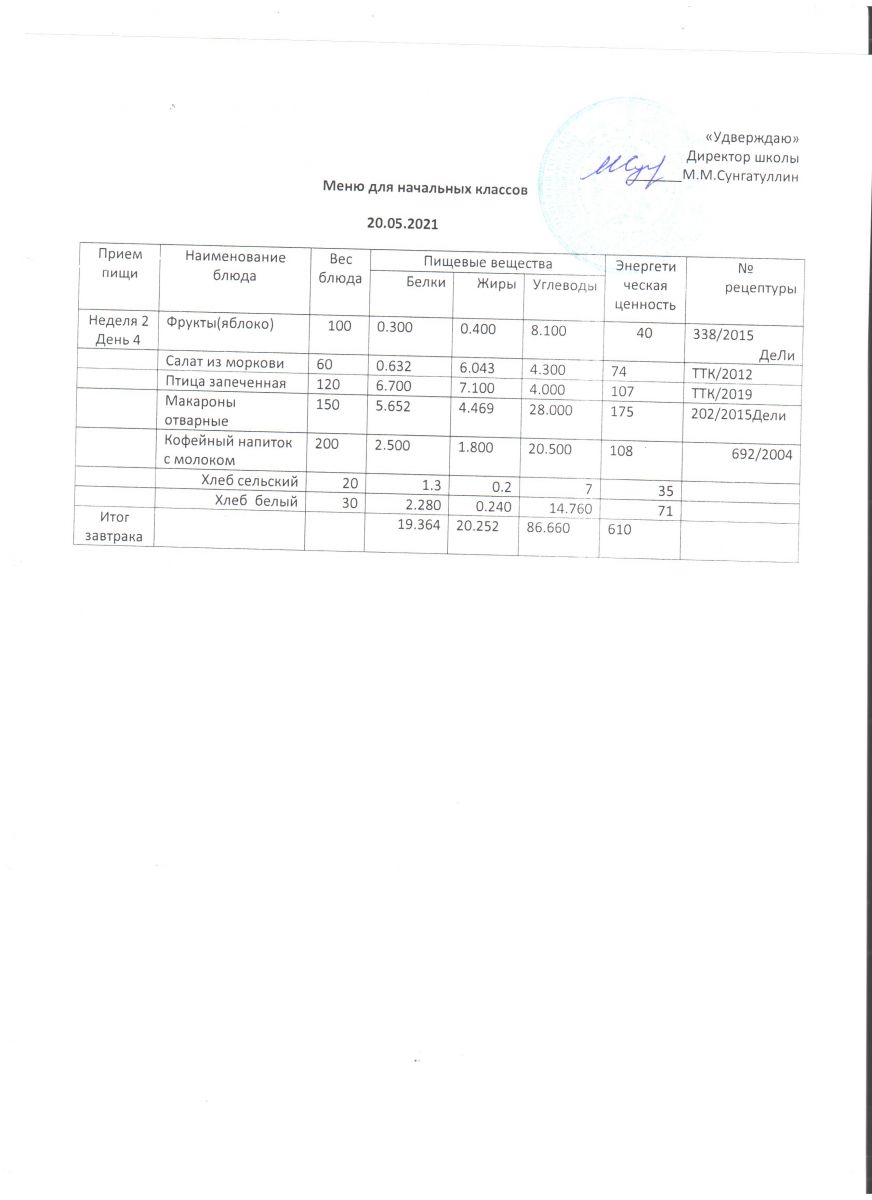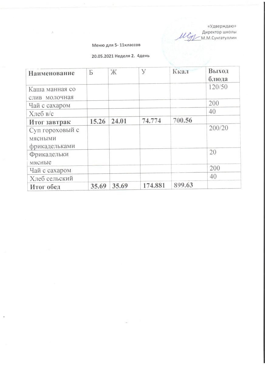 Меню для 5 - 11 классов на 20.05.2021 г.