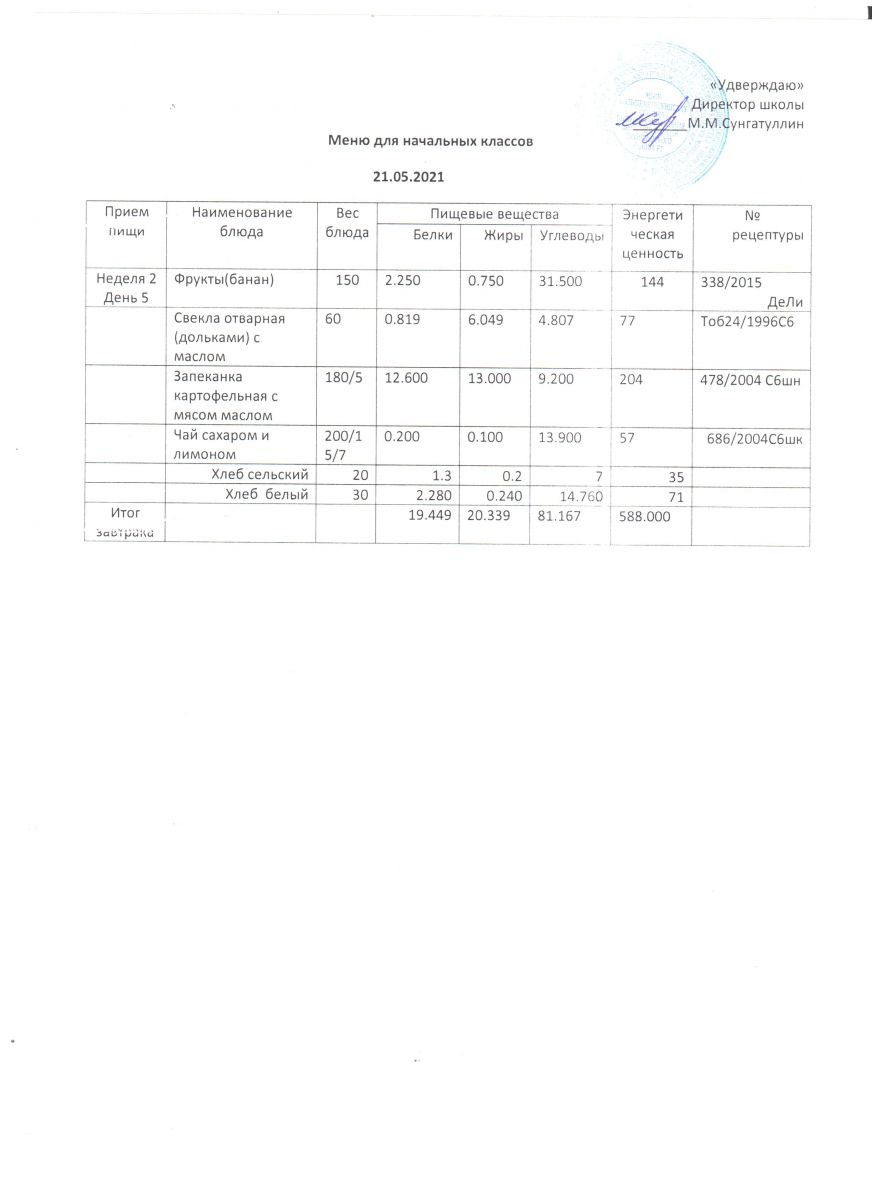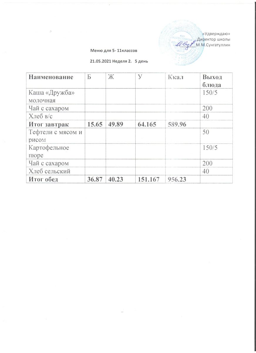 Меню для 5 - 11 классов на 21.05.2021 г.