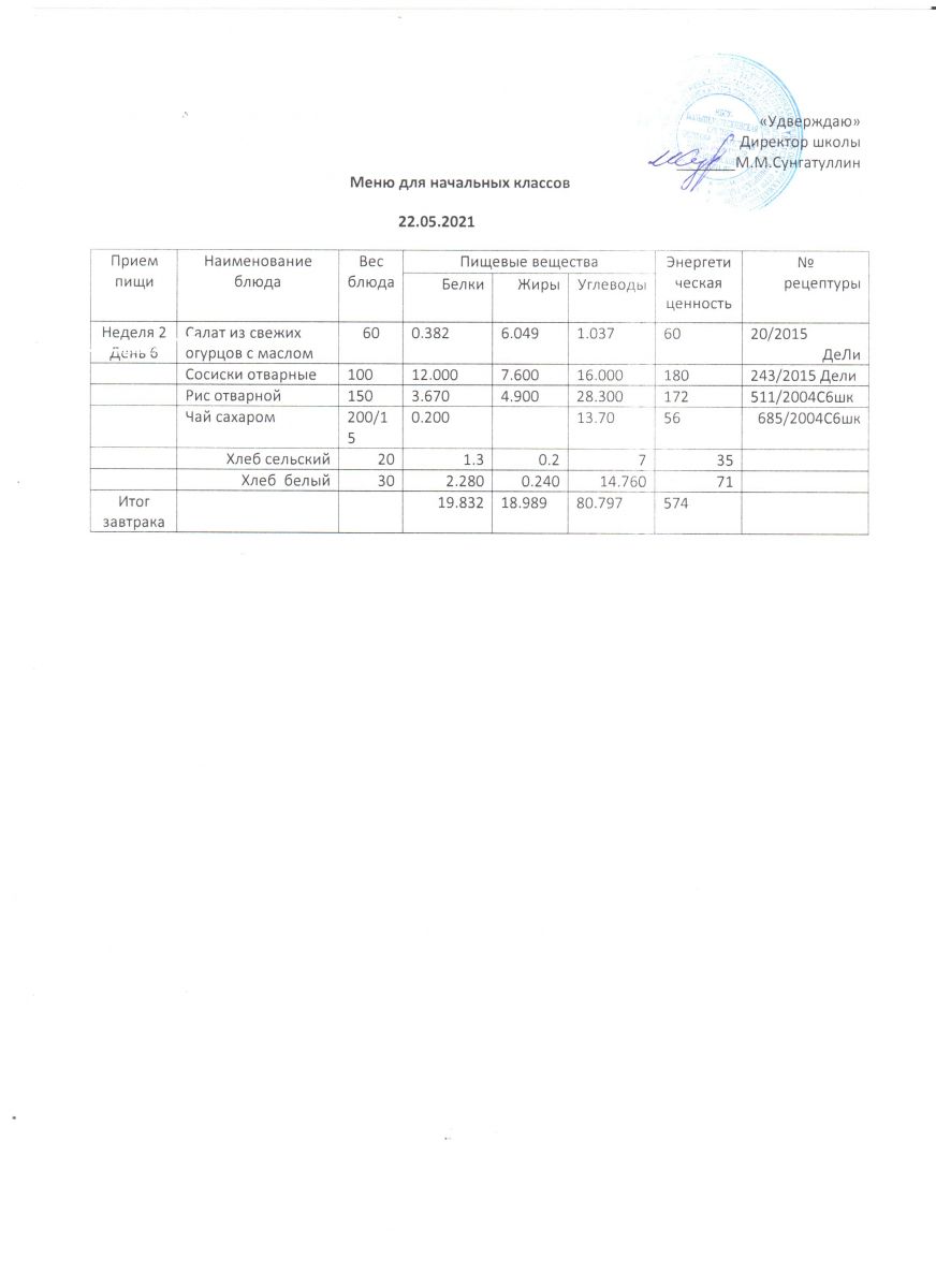 Меню для 5 - 11 классов на 22.05.2021 г.
