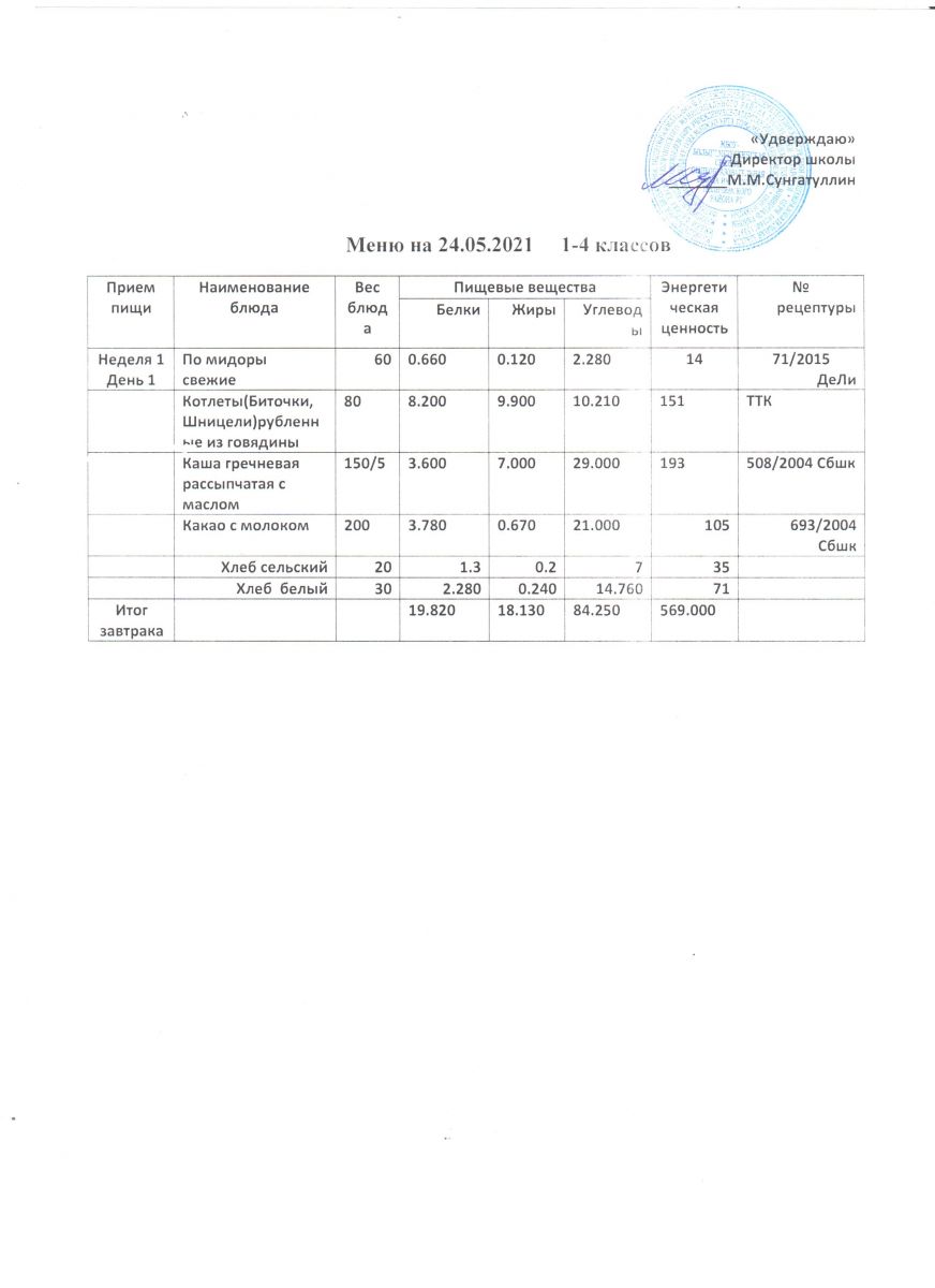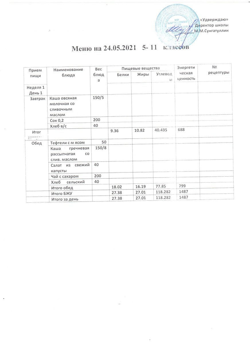 Меню для 5 - 11 классов на 24.05.2021 г.