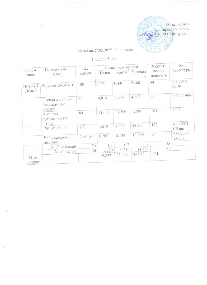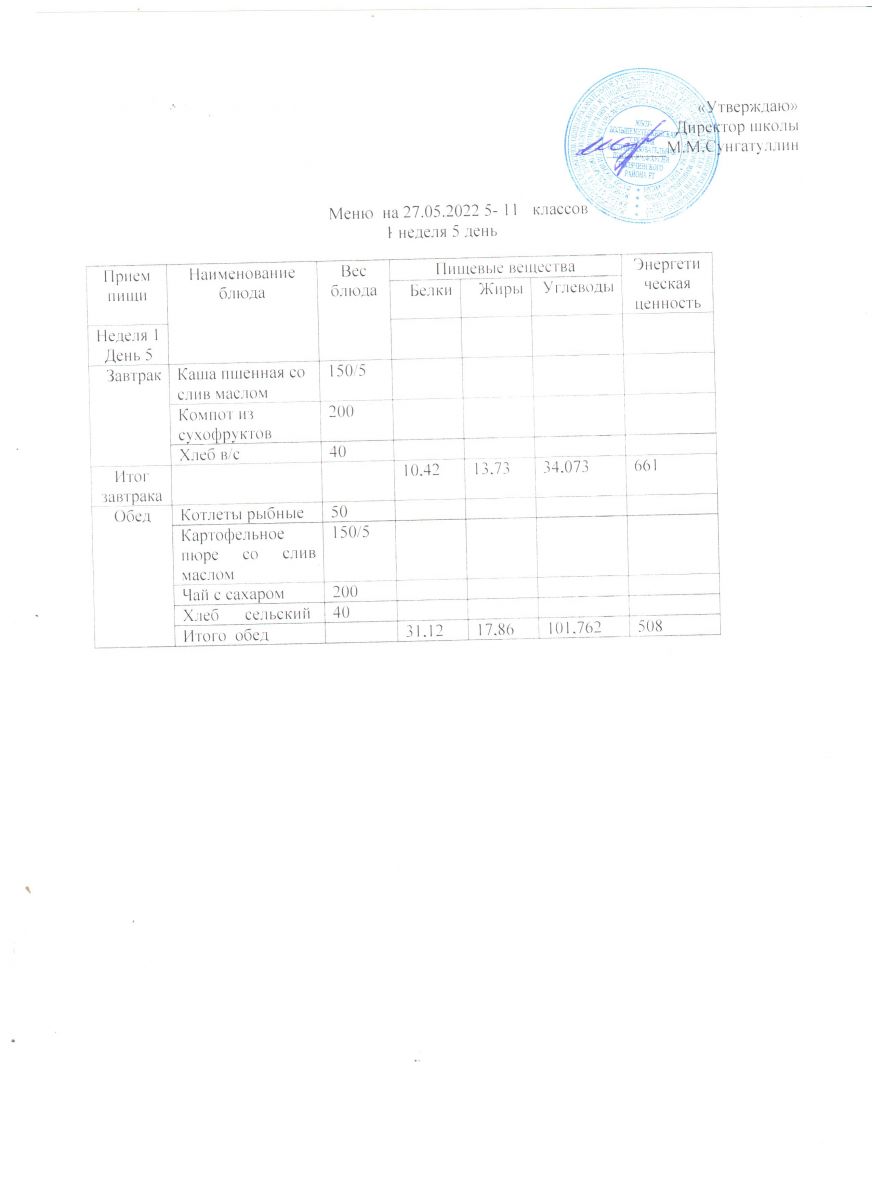 Меню для 5 - 11 классов на 27.05.2022 г.