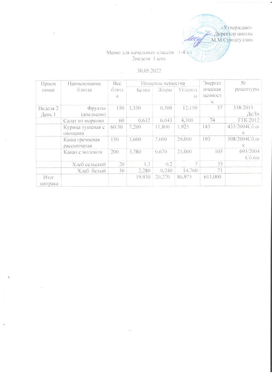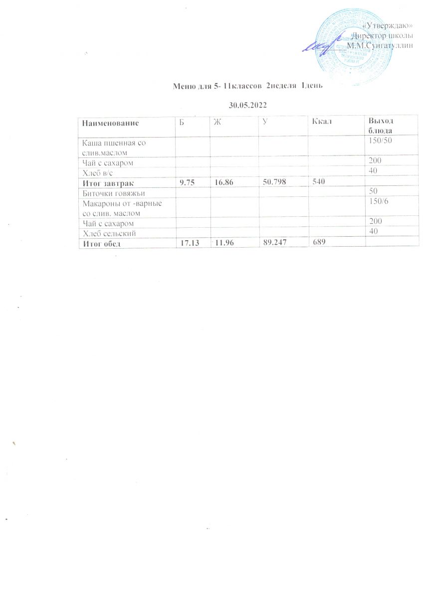 Меню для 5 - 11 классов на 30.05.2022 г.