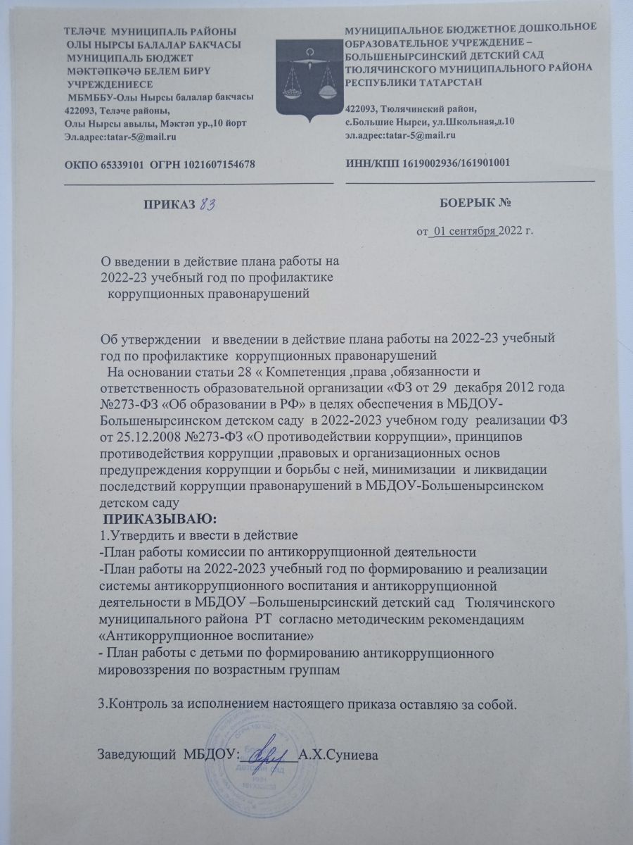 - Приказ О введение и действие плана работы на 2022-2023 учебный год по профилактике коррупционных правонарушений.