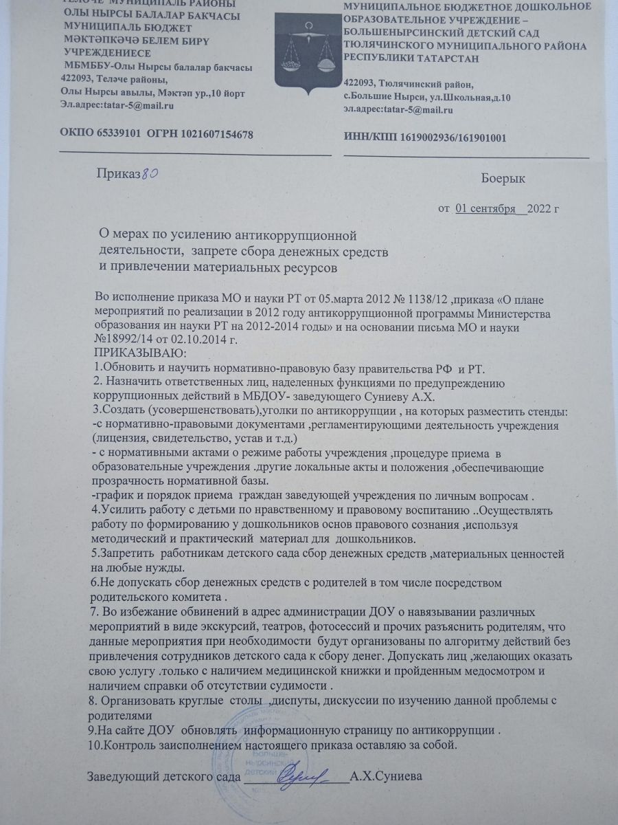 - Приказ О мерах по усилению антикоррупционной деятельности, запрете сбора денежных средств и привлечении материальных ценностей.