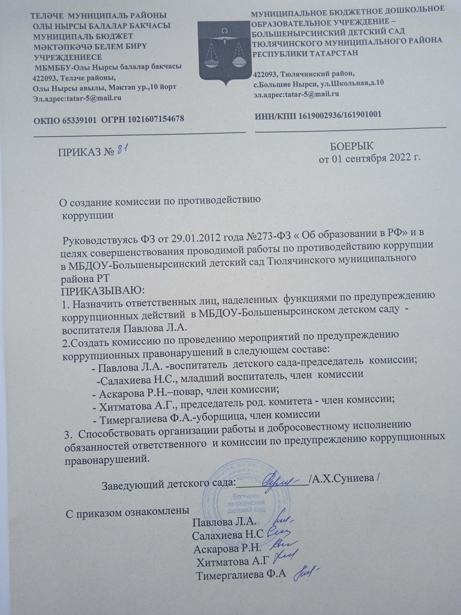 - Приказ О создании комиссии по противодействию коррупции.