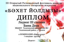 Первой приятной новостью в наступившем 2016 году стал Диплом Лауреата III степени 3-ого Открытого Регионального фестиваля – конкурса национального татарского искусства «Бәхет йолдызы”. Баева Дина- воспитанница нашего ДОУ –творчески всесторонне развитый ребенок – в этом конкурсе участвовала в номинации «Вокал-соло» 1 младшая группа, исполнила песню "Чәй эчәбез бергәләп". Поздравляем Баеву Дину и педагога Рафикову Л.А. и желаем дальнейших творческих успехов. -