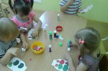 2нче кечкенәләр төркемендә бүген ябыштыру шөгыле узды. Җиләк- җимешләр темасын ныгыттып, кисеп , җиләк-җимешләрне “банкага” ябыштырдылар. Әлеге төр эшләу алымы төркемебездә бармак моторикасын үстерү өчен бик кулай алым. Бу эшләү алымы балаларга бик ошады, алар бик канәгать калдылар.