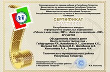 С 10 сентября по 20 ноября текущего учебного года проводился Республиканский конкурс информационно-социальных видеороликов «Ребенок в мире прав» - «Бала хокук даирәсендә». Учредителями Конкурса являются Уполномоченный по правам ребенка в Республике Татарстан, Министерство образования и науки Республики Татарстан, Министерство по делам молодежи Республики Татарстан, Министерство юстиции Республики Татарстан, Республиканское агентство по печати и массовым коммуникациям "Татмедиа". Обучающиеся объединения «Кино и дети» (руководитель Солонцов М.А.) Центра детского творчества приняли участие в этом конкурсе и были отмечены Сертификатом за участия.