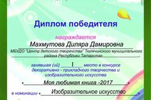 Обучающаяся объединения «Волшебная паутинка» Центра детского творчества Махмутова Диляра Дамировна, под руководством педагога дополнительного образования Галимзяновой Фании Габдулхаковны, заняла 1 место в конкурсе декоративно-прикладного творчества и изобразительного искусства «Моя любимая книга – 2017», в рамках международного творческого проекта «Как прекрасен этот мир».Балалар иҗат үзәгенең “Серле пәрәвез” түгәрәгенә йөрүче Махмутова Диләрә Дамир кызы, өстәмә белем бирү педагогы Галимзянова Фәния Габдулхак кызы җитәкчелегендә, “Минем яраткан китабым – 2017” дип исемләнгән рәсем һәм кул эшләре конкурсында катнашып 1 урынга лаек булды.