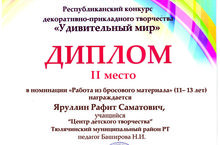 Обучающийся объединения «Юный моделист» Центра детского творчества Яруллин Рафит Саматович, под руководством педагога дополнительного образования Башировой Нурии Ильдусовны, занял 2 место в Республиканском конкурсе декоративно-прикладного творчества “Удивительный мир”, в номинации “Работа из бросового материала”.