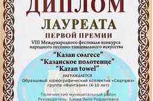 Образцовый хореографический детский коллектив «Сюрприз» руководитель Баева Зиля Рафаиловна Центра детского творчества Тюлячинского муниципального района стали лауреатами первой премии VIII Международном фестивале-конкурсе народного песенно-танцевального искусства «Казанское полотенце».