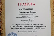 25 нче апрель көнне район мәдәният йортында Җиңүнең 70 еллыгына багышланган “Салют, Җиңү!” дип аталган XVII балалар сәнгать фестивале булып үтте. Әлеге фестивальдә безнең мәктәптән 8 ниче сыйныф укучысы Исмәгыйлева Диләрә катнашты. Ул “Вокал-соло” номинациясендә икенче урын алды һәм грамота белән бүләкләнде.