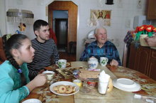 23 нче февраль көнне "Алтын куллар" түгәрәге җитәкчесе Музафарова С.Ю. һәм түгәрәккә йөрүче 6 нчы сыйныф укучысы Сонгатова Таңсылу белән Олы Нырсы авылында яшәүче сугыш ветераны Писерев Алексей Ивановичны Ватанны саклаучылар көне белән котлау максатыннан очрашу булды.23 февраля руководитель кружка "Алтын куллар" Музафарова С.Ю. и ученица 6 класса Сонгатова Тансылу посетили ветерана ВОВ Писерева Алексей Ивановича