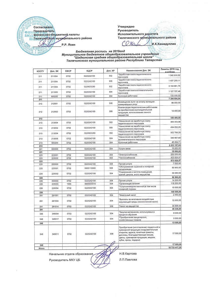 Бюджетная роспись на 2019 год МБОУ - Шадкинская СОШ Тюлячинского муниципального района